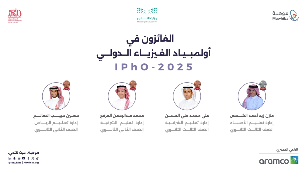 حقق فريق الفيزياء السعودية إنجازًا علميًا جديدًا من خلال الفوز بأربعة ميداليات دولية في المسابقات" أولمبياد الفيزياء الدولية 2025 في الإصدار 55 ، الذي عقد في العاصمة الفرنسية ، باريس ، من 17 إلى 25 يوليو ، بمشاركة (425) طلاب يمثلون (85) دولة. 3 الميدالية البرونزية." المملكة ثمرة لتأهيلهم خلال آلاف ساعات التدريب من قبل مؤسسة الملك عبد العزيز ورجالها من أجل المواهب والإبداع "الموهبة"في الشراكة الاستراتيجية مع وزارة التعليم ، ودعم شركة الراعي الحصري السعودي Aramco." أولمبياد الفيزياء تعد International ، التي شاركت فيها المملكة منذ عام 2011 ، واحدة من أقدم المسابقات العلمية الدولية ، حيث بدأت نسختها الأولى في عام 1967 في بولندا ، وتهدف إلى تطوير مهارات الطلاب في التفكير الإبداعي والتحليل العلمي وحل المشكلات. وإعدادهم للمنافسة العالمية في مختلف مجالات العلوم والابتكار.