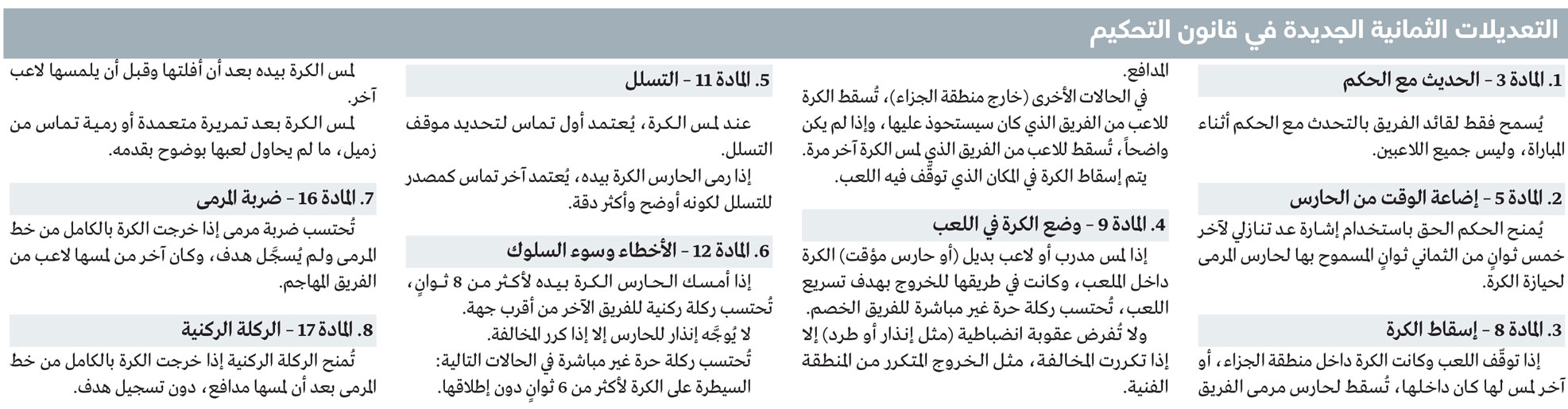 وأضاف أن أحد أبرز التعديلات هو تعديل المادة (3) ، والذي ينص على أنه لا يُسمح إلا لزعيم الفريق بالتحدث مع الحكم خلال المباراة ، وليس جميع اللاعبين ، حيث تضمنت التعديلات المقال (5) الذي يمنح الحكم الحق في استخدام إشارة الركود إلى حارس المرمى في آخر خمس ثوانٍ مسموح به للحيوية ، من خلال التأكد من التزامن.