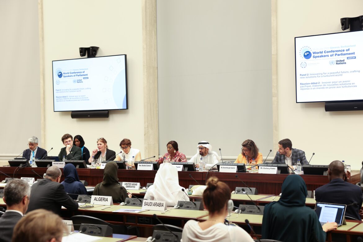 جنيف في 30 يوليو/ وام/ ترأس معالي الدكتور علي راشد النعيمي، رئيس لجنة شؤون الدفاع والداخلية والخارجية في المجلس الوطني الاتحادي، الجلسة الحوارية التي ناقشت موضوع الابتكار من أجل مستقبل سلمي، وذلك ضمن أعمال المؤتمر العالمي السادس لرؤساء البرلمانات الذي نظمه الاتحاد البرلماني الدولي بالتعاون مع منظمة الأمم المتحدة، وعقد في مقر الأخيرة بمدينة جنيف بالاتحاد السويسري، تحت عنوان: “عالم في حالة اضطراب: التعاون البرلماني وتعددية الأطراف من أجل السلام والعدالة للجميع”.
