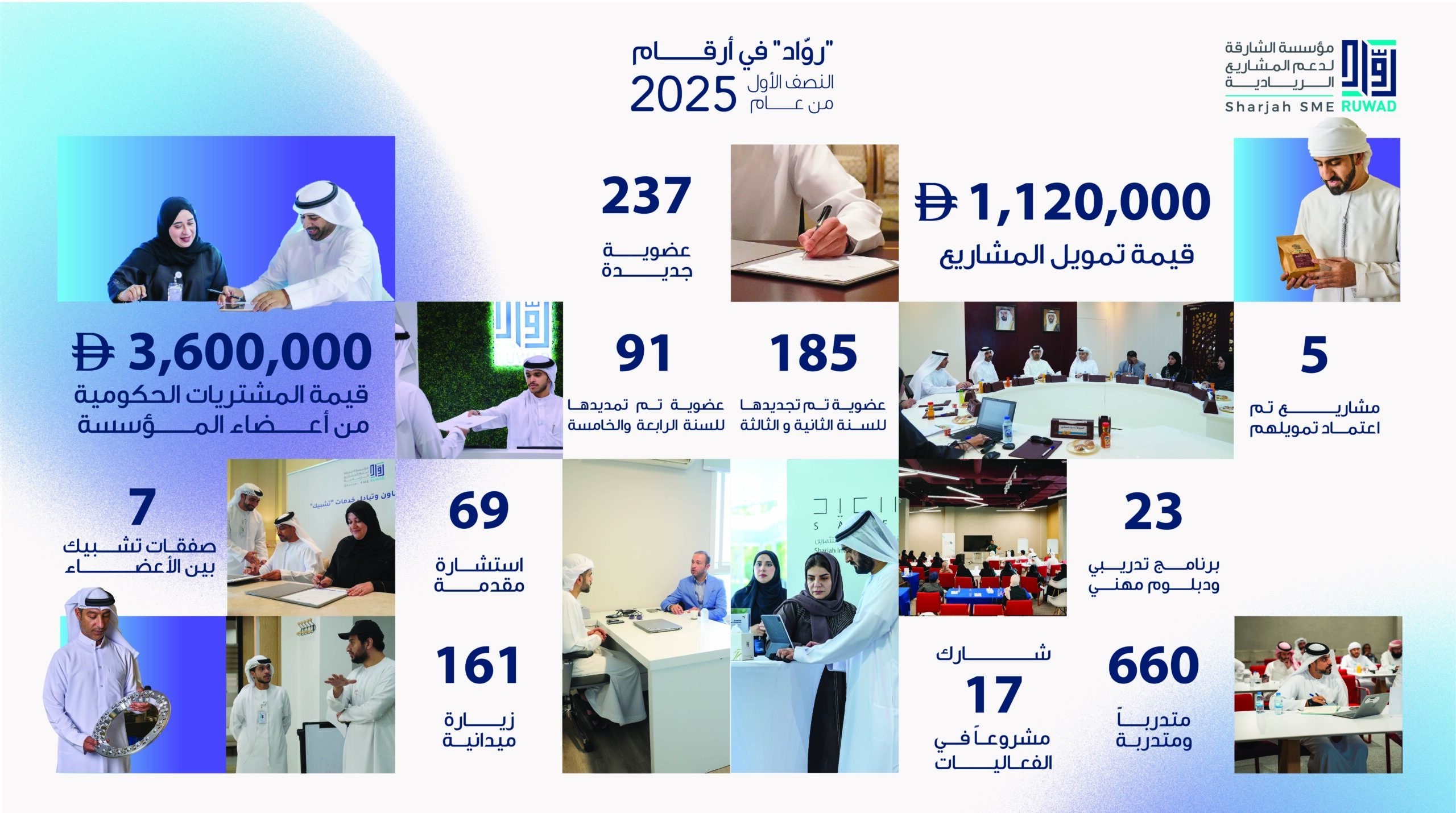 الشارقة في 30 يوليو/وام/ كشف التقرير السنوي لمؤسسة الشارقة لدعم المشاريع الريادية “رُوّاد” التابعة لدائرة التنمية الاقتصادية بالشارقة أن النصف الأول من العام الحالي 2025 سجل اعتماد تمويلات مباشرة من قبل المؤسسة بقيمة إجمالية بلغت مليونًا و120 ألف درهم لصالح خمسة مشاريع منها ثلاثة في القطاع المهني ومشروعان تجاريان .