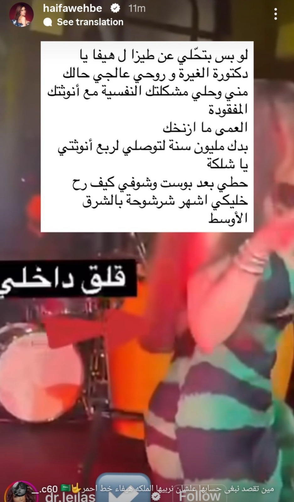 اختارت هيفا وضع حد للسيدة التي نُشرت على صفحتها على Instagram حول حركات المشاهير وتفسيرات لغة جسدها ، مع ما اعتبرته تعليقات مبالغ فيها ، مما أثار غضب النجم ودفعها إلى الرد مباشرة.