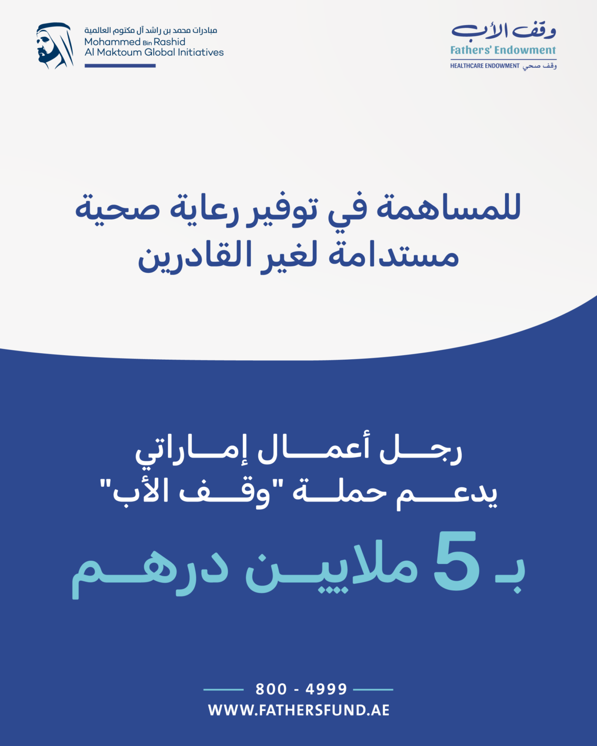دبي في 25 مارس/ وام/ ساهم رجل أعمال إماراتي، بمبلغ 5 ملايين درهم دعماً لحملة “وقف الأب” التي أطلقها صاحب السمو الشيخ محمد بن راشد آل مكتوم نائب رئيس الدولة رئيس مجلس الوزراء حاكم دبي “رعاه الله”، بهدف تكريم الآباء في دولة الإمارات من خلال إنشاء صندوق وقفي مستدام، يخصص ريعه لتوفير العلاج والرعاية الصحية للفقراء والمحتاجين وغير القادرين.