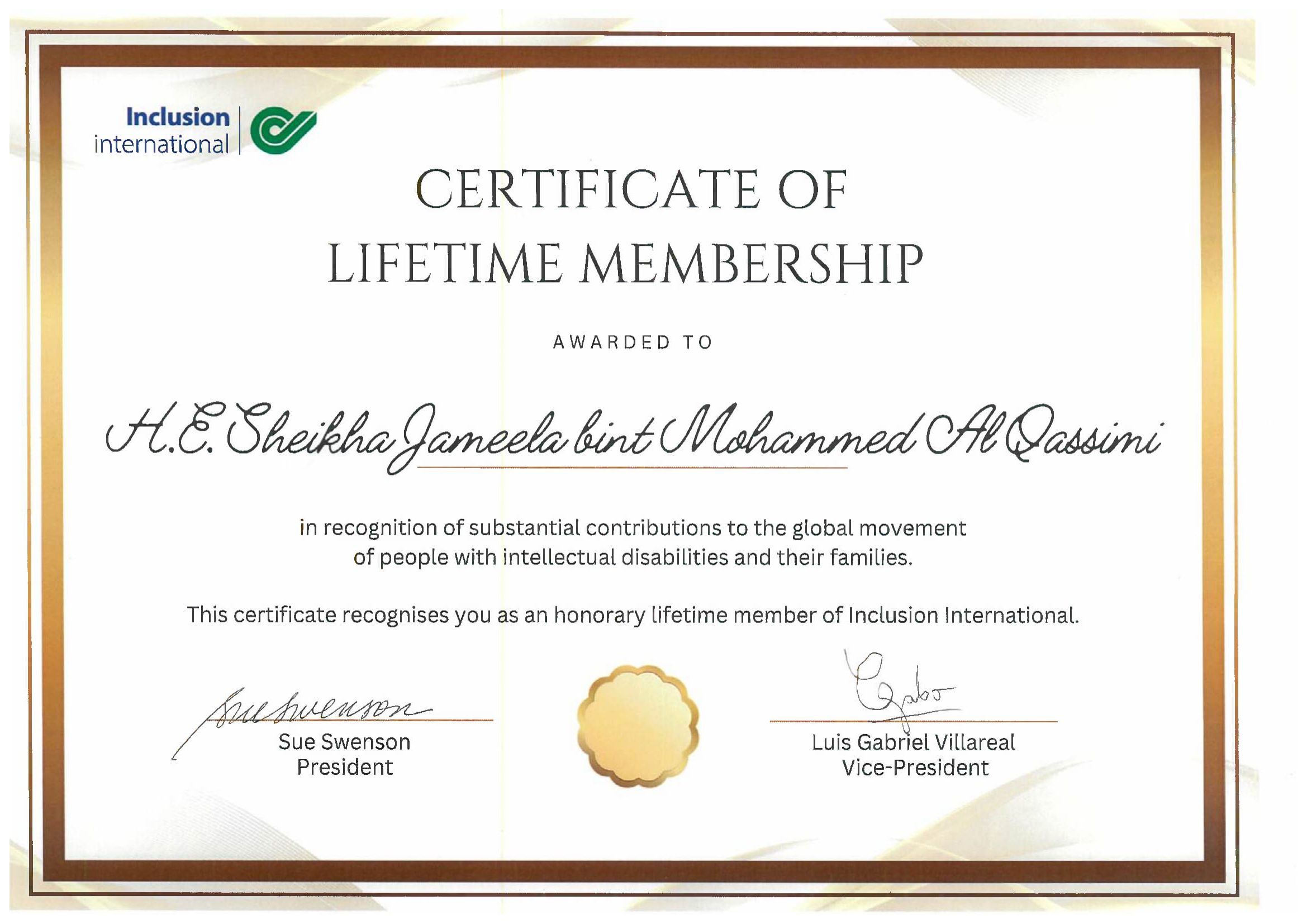 وتمثل هذه الشهادة تكريما دوليا رفيع المستوى من قبل المنظمة التي تعد أكبر شبكة عالمية تعنى بحقوق الأشخاص ذوي الإعاقة الذهنية وأسرهم ما يضع الشيخة جميلة القاسمي في مصاف القيادات العالمية التي أثرت بشكل ملموس في دعم حقوق وتمكين الأشخاص ذوي الإعاقة الذهنية على مستوى المجتمع الدولي.