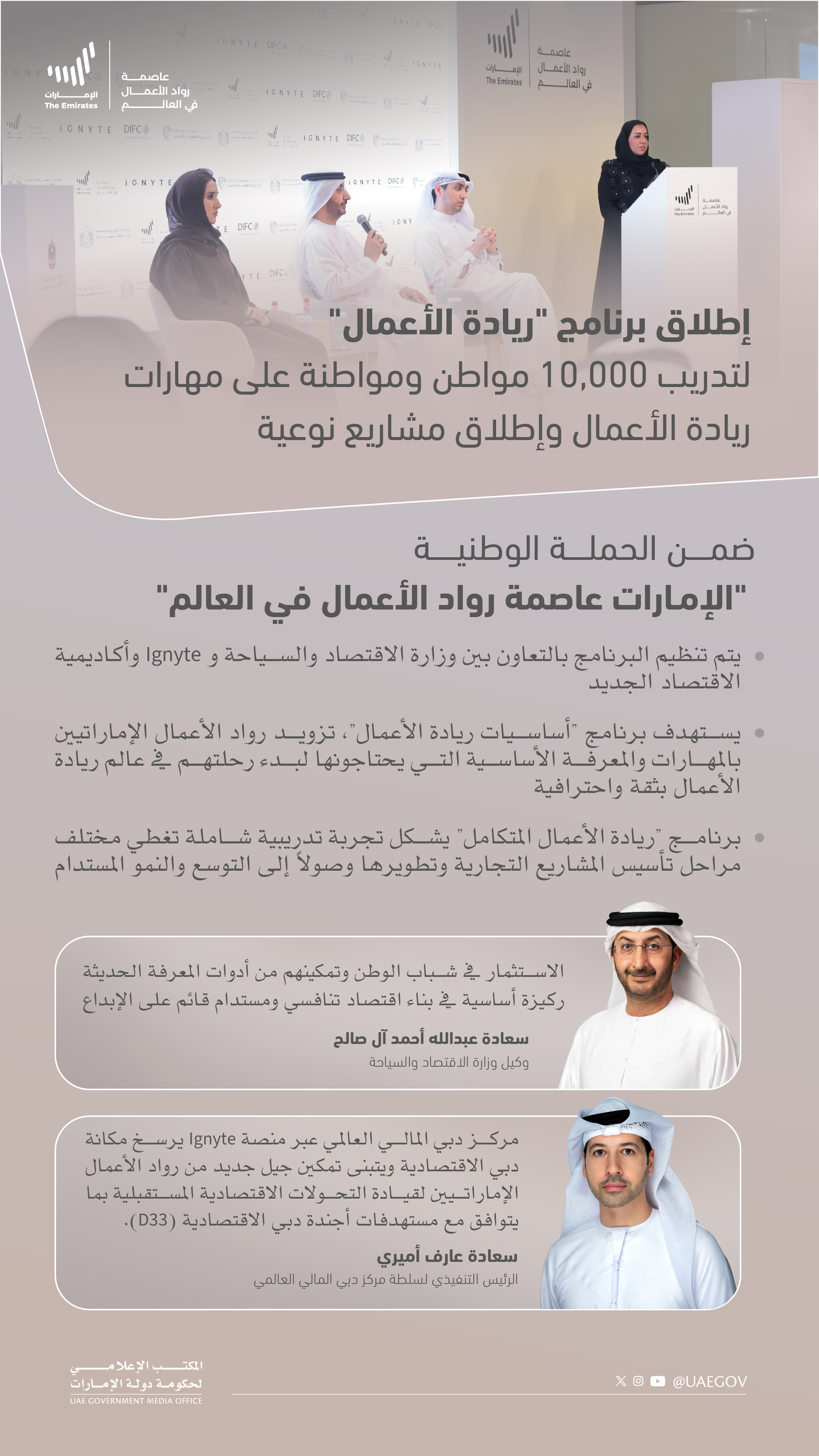 ويهدف برنامج “ريادة الأعمال” إلى استقطاب 10,000 مواطن ومواطنة في برنامج موحّد يجمع بين أساسيات وممارسات ريادة الأعمال لرواد الأعمال الجدد، وبرنامج متقدم يشمل رحلة شاملة من التأسيس إلى النمو المستدام والتوسع العالمي، وتدريبهم على مهارات ريادة الأعمال، وتمكينهم من إطلاق مشاريع نوعية تحقق نمواً محلياً وتنافسا عالمياً، وتوفير آلاف الفرص الاقتصادية وتعزيز مساهمة الشركات الصغيرة والمتوسطة في نمو الناتج المحلي غير النفطي للاقتصاد الوطني، بما ينسجم مع أهداف الدولة في تعزيز الاقتصاد القائم على الإبداع والمعرفة، ويعزز مكانة الإمارات مركزا عالميا لريادة الأعمال والابتكار.