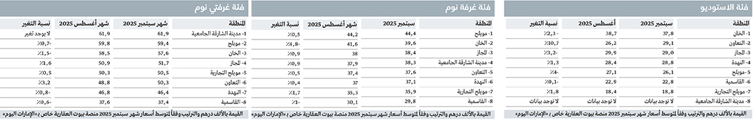 وفي فئة الاستوديو، أظهرت البيانات أن مناطق «الخان»، و«التعاون»، و«المجاز»، و«النهضة»، من أعلى المناطق من حيث متوسط تكلفة الإيجارات سنوياً خلال شهر سبتمبر 2025، في حين كانت مناطق «مويلح التجارية»، و«القاسمية»، و«مويلح» من المناطق الأقل من حيث متوسط تكلفة الإيجارات سنوياً خلال الشهر الماضي.