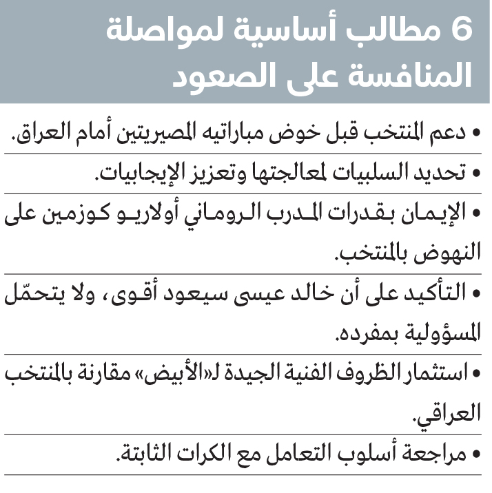 بدوره، أكد مدرب حراس مرمى منتخب الناشئين يوسف الزعابي، أن «المنتخب سيعود أقوى قبل مواجهة العراق يومي 13 و18 تشرين الثاني (نوفمبر)، خصوصاً مع تكافؤ الفرص بين الفريقين على مستوى الملعب والجمهور، وهو عامل مهم افتقده (الأبيض) في تصفيات الملحق الأخير».
