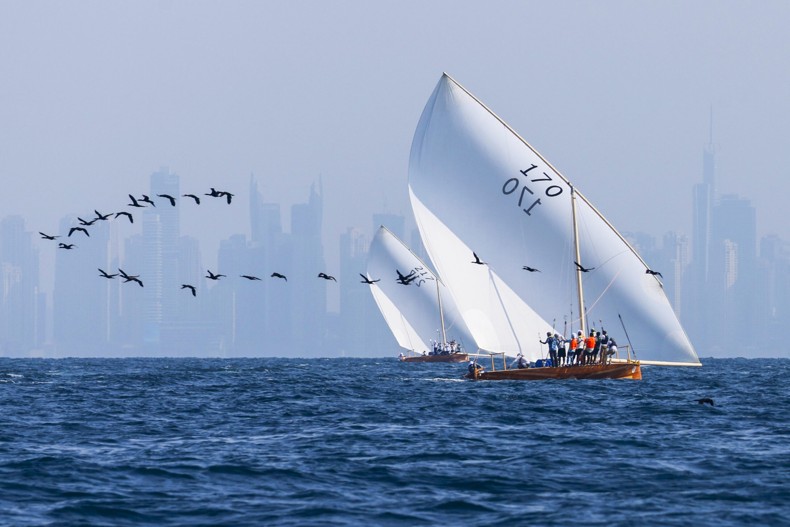 وشهدت المنافسات مشاركة 21 قارباً من نخبة المحامل الشراعية، قادها 315 من النواخذة والبحارة المواطنين، بمعدل 15 مشاركاً على كل قارب، حيث قدموا أداءً مميزاً ومهارات عالية في التعامل مع الرياح القوية، ما جعل التنافس مفتوحاً حتى اللحظات الأخيرة قبل أن يحسم “زلزال 217” اللقب لصالحه.