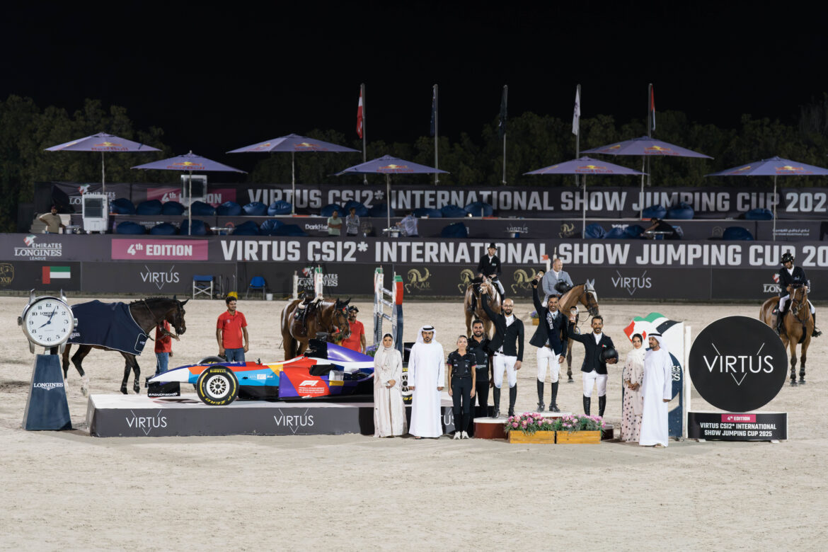 وتصدر فرسان الإمارات، منافسة دولية بمواصفات الجولة الواحدة على حواجز الـ 110 سم عبر الفارسين راشد خالد الجنيبي مع “كيرسينا”، وخليفة حمدان الجهوري مع “هيرمس دو ماريبوسا”، بينما فاز الفريق المكون من الفارسين صالح مفرج الكربي والجواد “اس كيه اس أريزونا توب”، والفارس السوري محمد هشام غريب بصحبة الجواد “نورديك قولد”، بمنافسة للفرق لإكمال المشاركة في زمن محدد على حواجز الـ 120 سم.