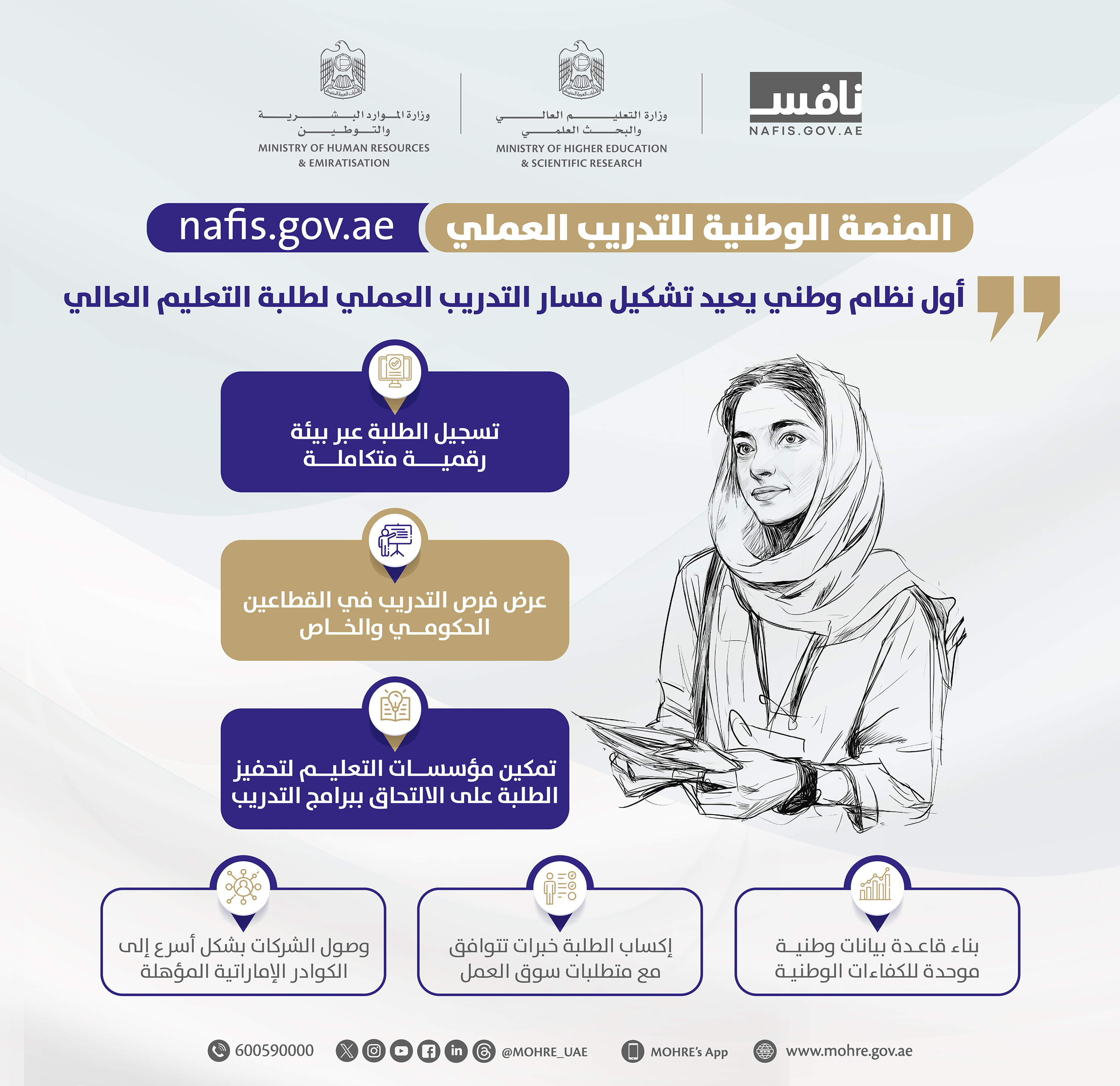 وتتيح المنصة التي تم إطلاقها ضمن منصة “نافس” للطلبة الجامعيين التسجيل في فرص التدريب العملي النوعي في سوق العمل بالدولة عبر بيئة رقمية متكاملة ، كما تتيح لمؤسسات وشركات القطاعين الحكومي والخاص عرض فرص التدريب المتوفرة لديها، بما يرسخ دورها كشريك أساسي في المنظومة الوطنية للتدريب العملي، ويسهم في إعداد أجيال مؤهلة تمتلك الخبرات والمهارات العملية المطلوبة في سوق العمل، من خلال تمكين الطلبة من الانخراط في برامج تدريبية عالية المستوى، ضمن مختلف القطاعات الحيوية، بما يعزز التكامل بين النظري والعملي في رحلة الطالب، ويسهم بدعم جهود التنمية الاقتصادية والمعرفية في الدولة.