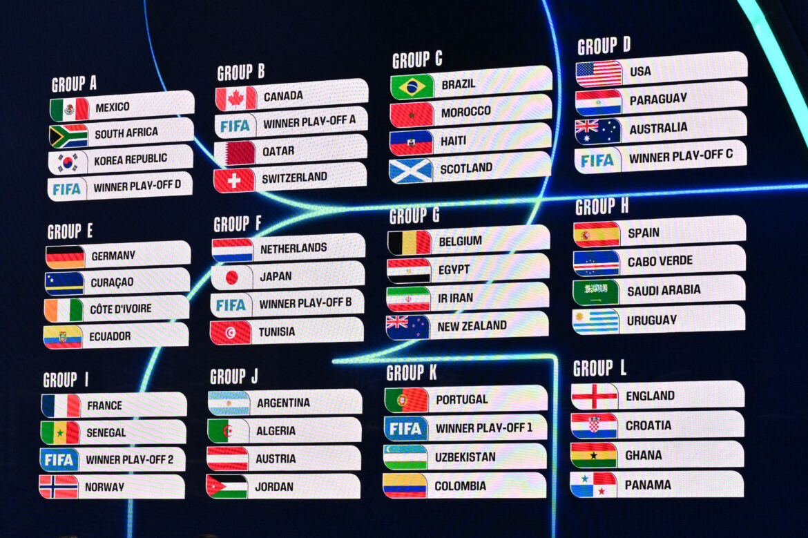 ووفق ترتيب المجموعات، أسفرت القرعة عن وقوع المنتخب القطري في المجموعة الثانية إلى جانب منتخبات كندا وسويسرا ومتأهل من الملحق الأوروبي، بينما جاء المنتخب المغربي في المجموعة الثالثة مع البرازيل وهايتي واسكتلندا.