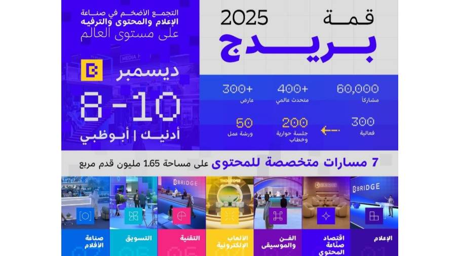 تنطلق يوم الاثنين، قمة الجسر 2025، في العاصمة أبوظبي، والتي تتضمن 7 مسارات رئيسية تتناول المحتوى الرقمي…