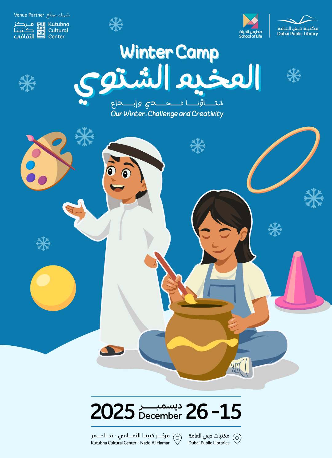 أما مخيم مكتبات دبي العامة الشتوي الذي يقام من 15 إلى 26 ديسمبرالجاري تحت شعار شتاؤنا تحدي وإبداع فيقدم ورشا متنوعة في الرسم بالأكريليك والفخار والرسم ثلاثي الأبعاد والرسم بالرمل ومسرح الظل إضافة إلى أنشطة يدوية وألعاب جماعية تنمي روح التعاون والتركيز وتعزز ارتباط الأطفال بالتراث عبر ورش صناعة السقا والطوي.