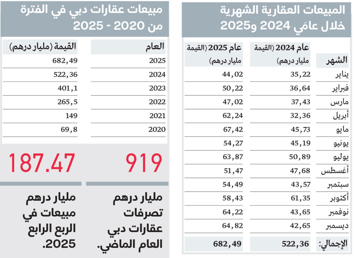 وبحسب رصد أعدته «الإمارات اليوم»، استناداً إلى بيانات دائرة الأراضي والأملاك في دبي، قفزت مبيعات العقارات في دبي خلال عام 2025 بنسبة 30.64% على أساس سنوي لتصل إلى أكثر من 682.49 مليار درهم، مقارنة بمبيعات بلغت 522.36 مليار درهم في عام 2024.