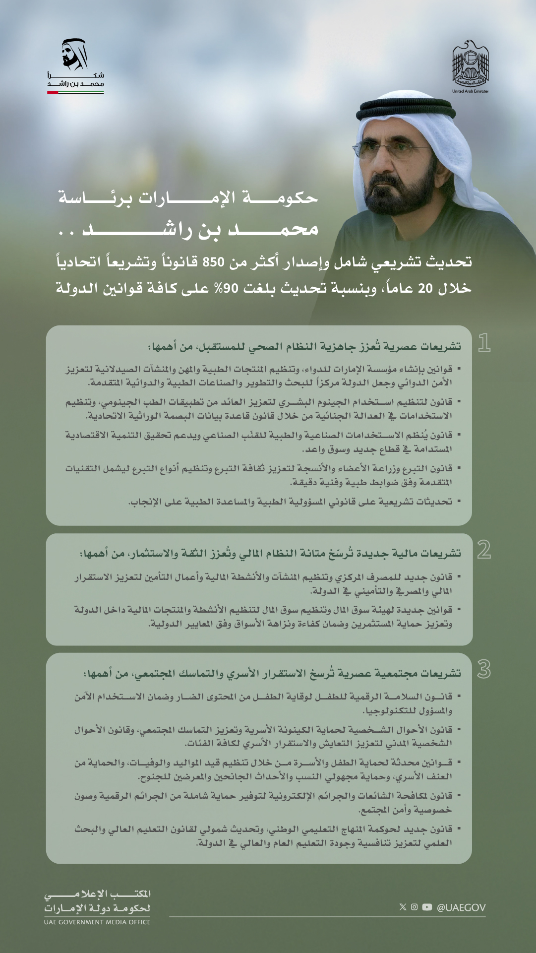 ويُجسّد هذا التحول التشريعي نهجاً متكاملاً في إصدار تشريعات وقوانين شاملة ومنظمة تواكب المتغيرات المتسارعة، وتدعم التنمية المستدامة، وتحقق تطلعات مجتمع دولة الإمارات، وتحافظ على مكتسباتها الوطنية، وتصنع مستقبلاً يليق بما تستحقه الأجيال القادمة. حيث أنجزت حكومة دولة الإمارات تحديث أكثر من 90% لكافة قوانين الدولة، وإلغاء أكثر من 100 قانون اتحادي لم يعد يصلح للتنمية المتسارعة التي تشهدها الدولة، كما تم استحداث وإصدار أكثر من 50 قانون لأمرة مرة في الدولة لدعم القطاعات المستقبلية.
