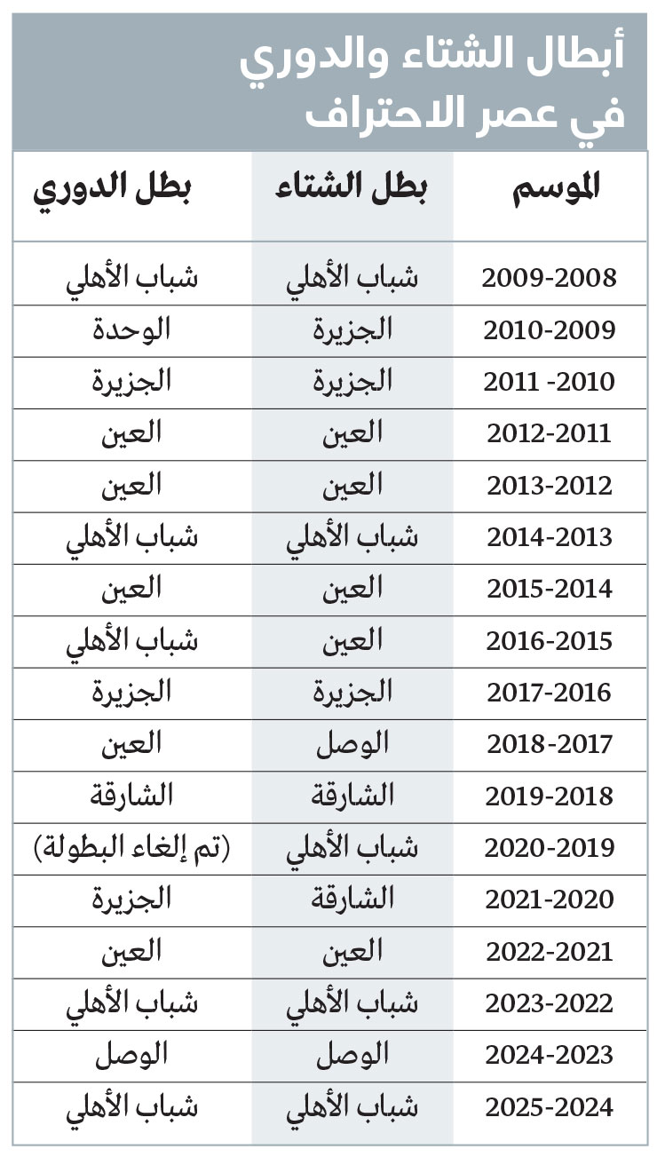 في المقابل، يحتل «فرسان دبي» المركز الثاني برصيد 29 نقطة، ويأمل أن ينجح الوحدة في تعطيل «الزعيم» ومن ثم خوض مواجهته أمام دبا بعد غد ليحسم اللقب الفخري. وتزداد سخونة النسخة الحالية بسبب المنافسة القوية بين الفريقين، خاصة أن جماهير الفريقين لا تزال تذكر سيناريو موسم 2015-2016، عندما فاز العين بلقب بطل الشتاء، لكن شباب الأهلي كان له كلمته في نهاية الموسم وتوج بطلاً، بعد أن جمع 66 نقطة، ليبقى الوصيف خلف “الزعيم” برصيد 57 نقطة.