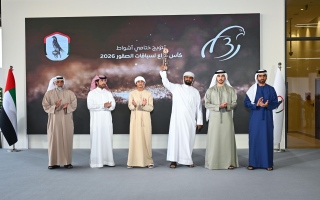 والتقط صاحب السمو الشيخ محمد بن راشد بن محمد بن راشد آل مكتوم، صورة تذكارية مع الصقارين الفائزين، في ختام النسخة الثانية من كأس فزاع لسباقات الصقارة.