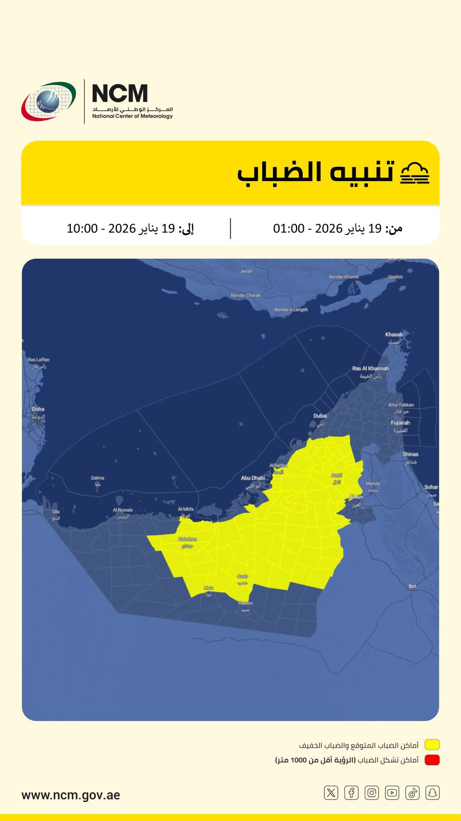 أبوظبي في 18 يناير/ وام / حذر المركز الوطني للأرصاد من فرصة تشكّل الضباب وانخفاض مدى الرؤية الأفقية، وحتى انعدامه أحياناً، على بعض المناطق الداخلية والساحلية خلال الفترة من الساعة 01:00 وحتى الساعة 10:00 من صباح يوم غد.
