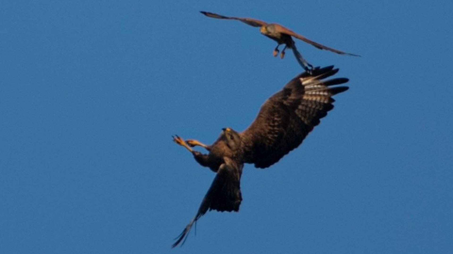 دبي، الإمارات العربية المتحدة (CNN)– تحولت السماء في السعودية، وتحديداً في منطقة عسير، إلى ساحة مصارعة خلال مواجهة نادرة وغير متوقعة بين نوعين من الطيور الجارحة..