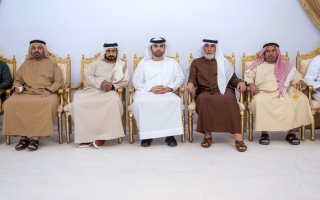 قدم سمو الشيخ منصور بن محمد بن راشد آل مكتوم، رئيس اللجنة الأولمبية الوطنية، اليوم، واجب العزاء في وفاة محمد بن الشيخ جمعة المنصوري، خلال زيارته مجلس العزاء في دبي.