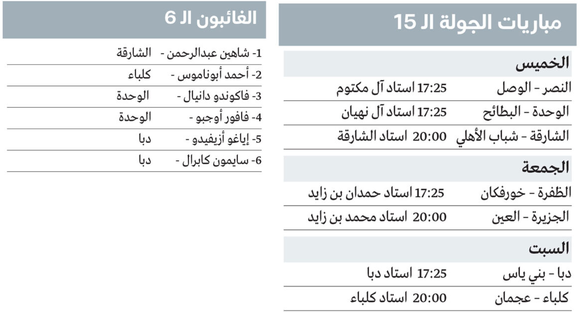 وبحسب إحصائيات «الإمارات اليوم» من الجولات الماضية، يتصدر قائمة الغائبين مدافع فريق الشارقة شاهين عبدالرحمن، بسبب تراكم البطاقات الصفراء، بعد حصوله على الإنذار الأول أمام العين في الجولة الحادية عشرة، والثاني أمام كلباء في الجولة الثالثة عشرة، قبل أن يحصل على البطاقة الصفراء الثالثة خلال مباراة الظفرة في الجولة الرابعة عشرة الأخيرة.