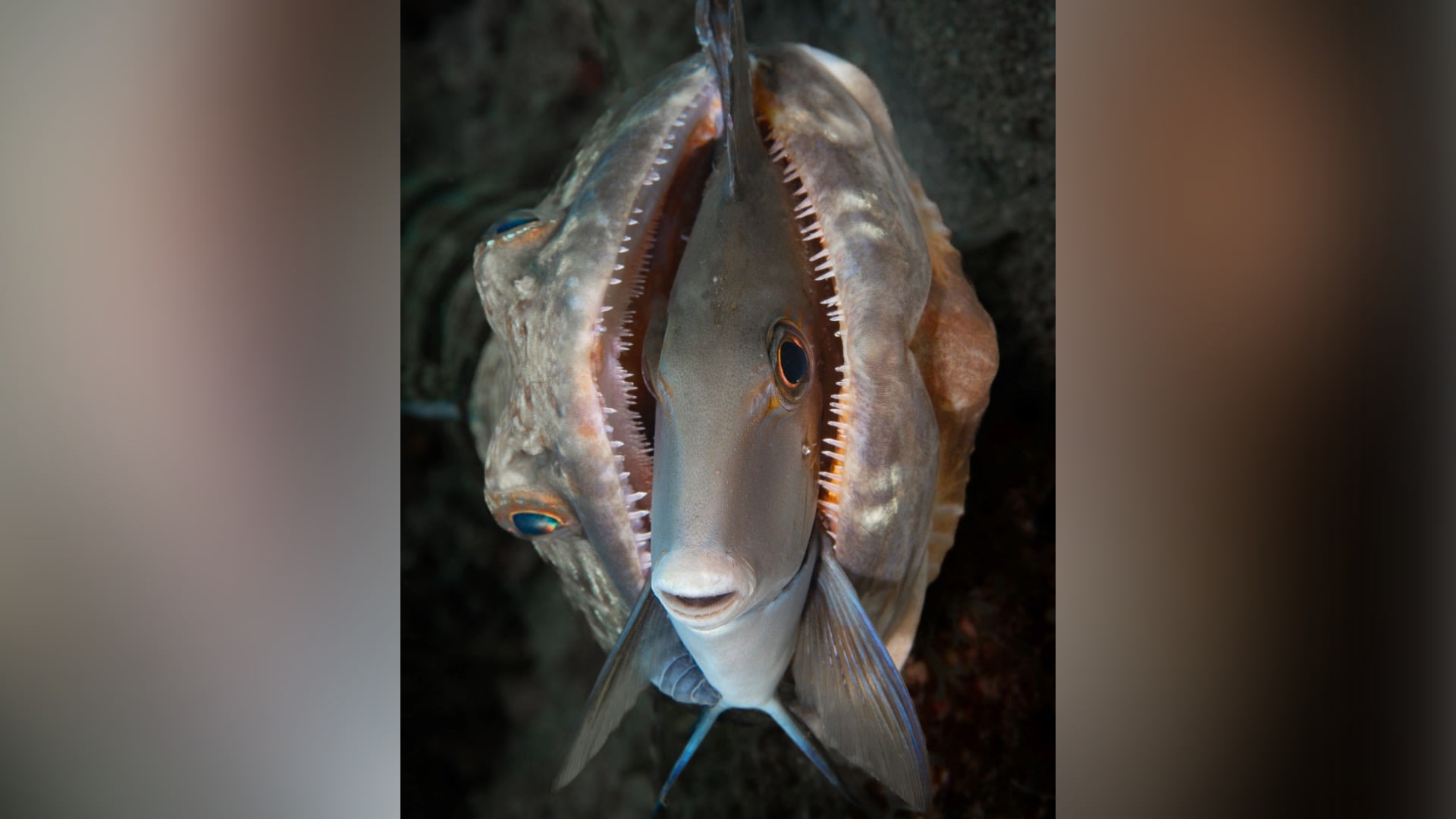 وتظهر الصورة، التي وثقها جنسن في فلوريدا عام 2023، سمكة جراح تبدو هادئة بشكل هزلي على الرغم من وجودها في فكي سحلية كانت تحاول أكلها.