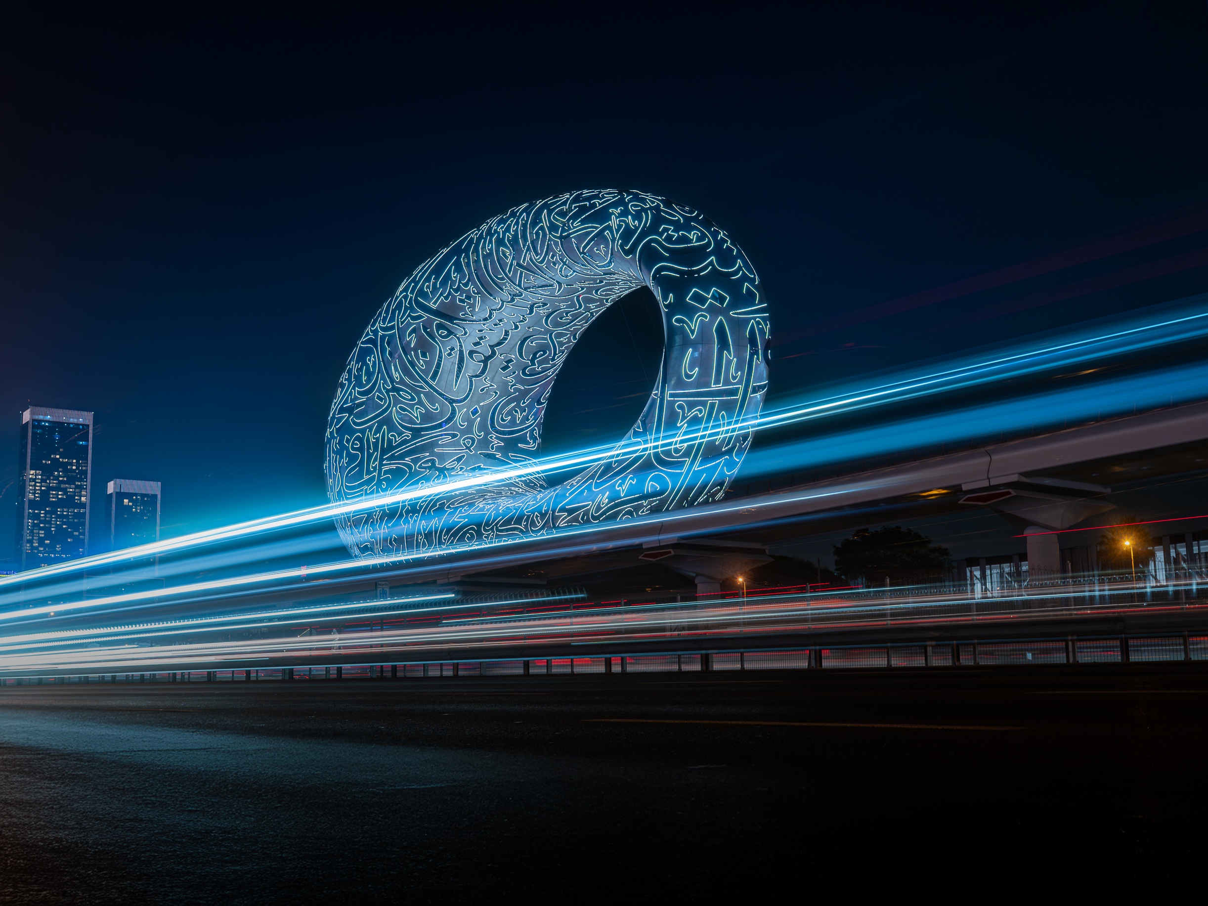 ويجسّد مبنى متحف المستقبل، في بُعده المعماري، سردية دبي في تحويل الأفكار الجريئة إلى واقع، إذ يرتفع 77 متراً بتصميم أيقوني يجمع بين الابتكار الهندسي والرمزية الثقافية، وتتألف واجهته من 1024 قطعة مصنوعة بدقة متناهية تغطي مساحة 17600 متر مربع، فيما تتزيّن الواجهة بالخط العربي الذي يحمل مقولات صاحب السمو الشيخ محمد بن راشد آل مكتوم، رعاه الله، لتبقى رسالة المتحف في التخيّل والابتكار حاضرة في المشهد الحضري للمدينة.
