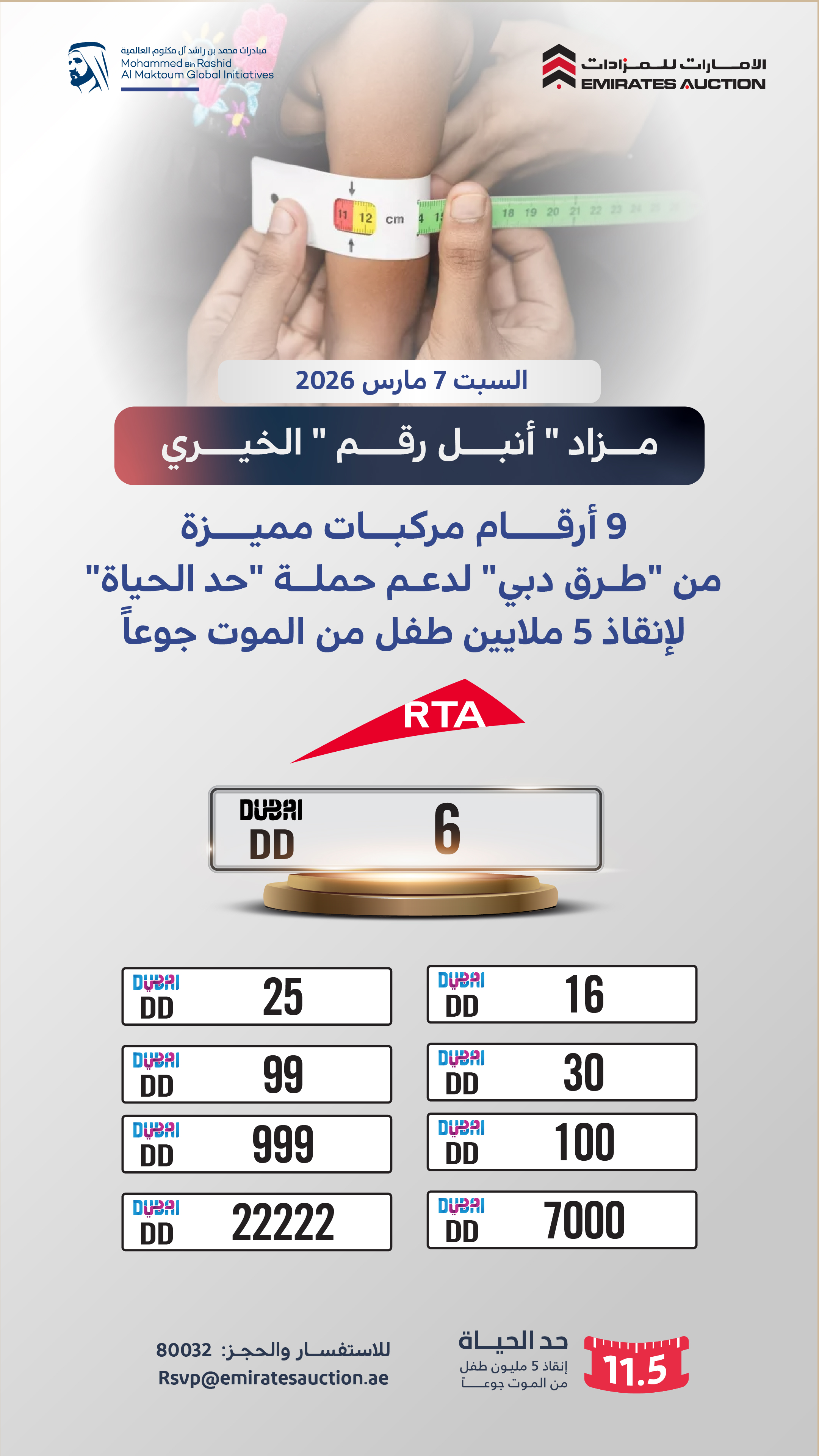 دبي في 2 مارس/ وام/ يدعم مزاد “أنبل رقم” الخيري في دبي الذي ينطلق 7 مارس الجاري، مستهدفات حملة “حد الحياة” لإنقاذ 5 ملايين طفل من الموت جوعاً، والتي أطلقها صاحب السمو الشيخ محمد بن راشد آل مكتوم نائب رئيس الدولة رئيس مجلس الوزراء حاكم دبي “رعاه الله”، بالتزامن مع شهر رمضان الكريم، لجمع مليار درهم على الأقل يتم استثمارها في مكافحة جوع الأطفال في العالم.