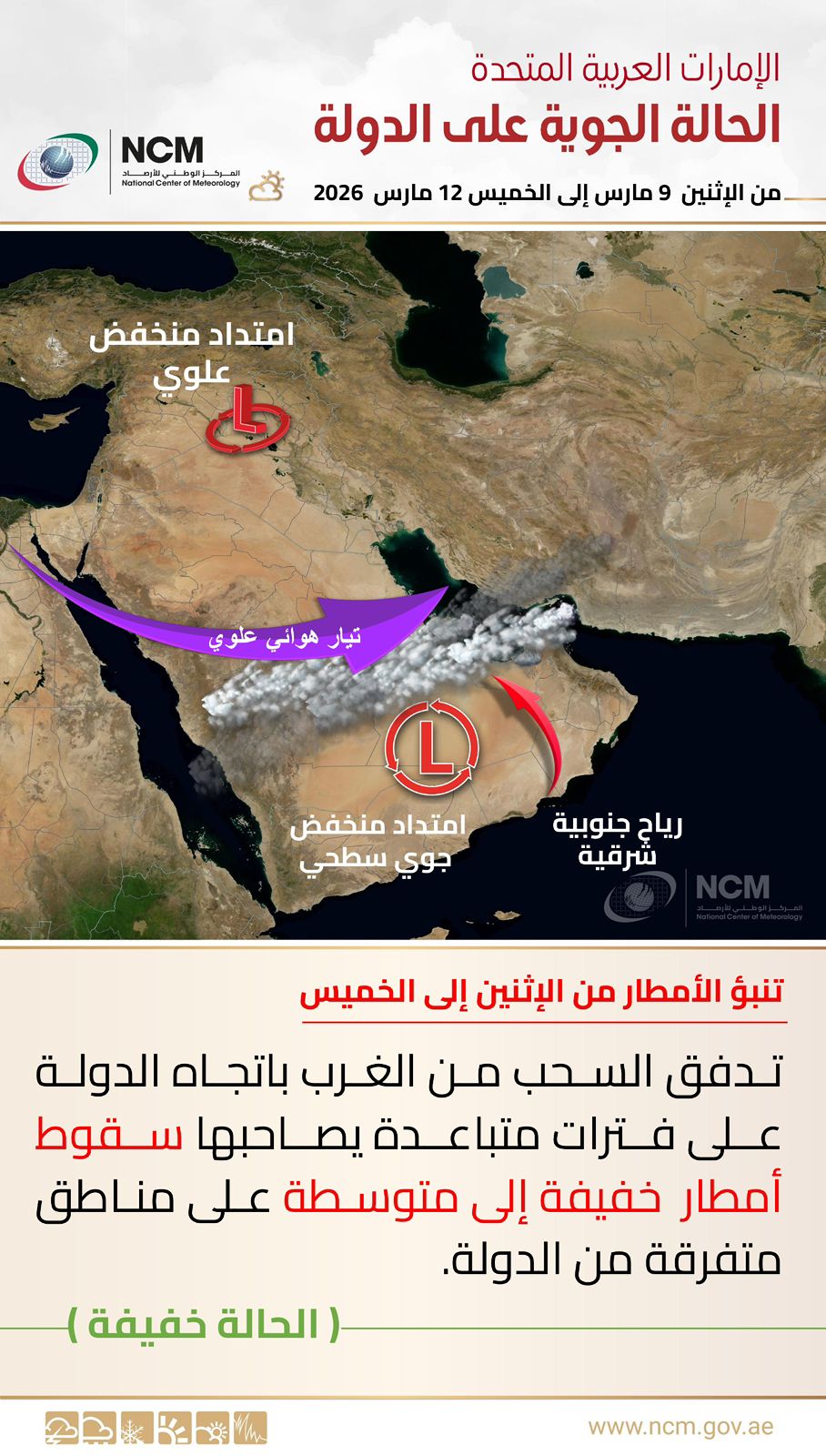 أبوظبي في 9 مارس/ وام/ توقع المركز الوطني للأرصاد تدفق السحب من الغرب باتجاه الدولة على فترات متباعدة خلال الفترة من اليوم وحتى 12 مارس الجاري، يصاحبها سقوط أمطار خفيفة إلى متوسطة على مناطق متفرقة من الدولة.