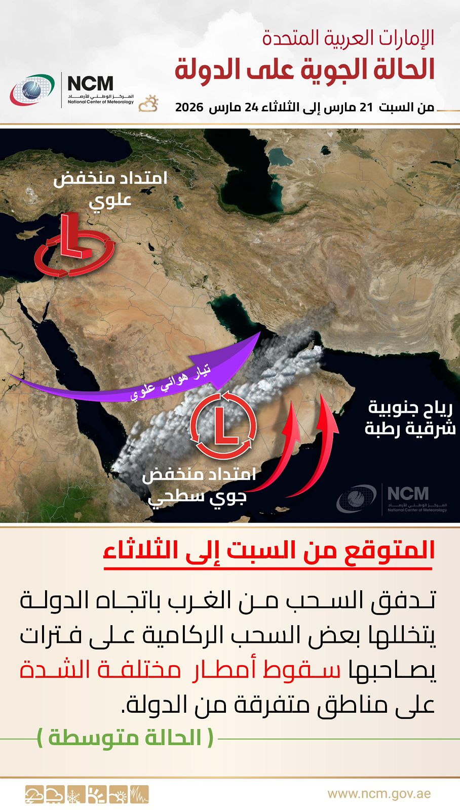 أبوظبي في 17 مارس/ وام / توقع المركز الوطني للأرصاد أن تشهد الدولة خلال الفترة من 21 إلى 24 مارس الحالي حالة جوية تتسم بتدفق السحب من الجهة الغربية باتجاه الدولة، تتخللها على فترات سحب ركامية.