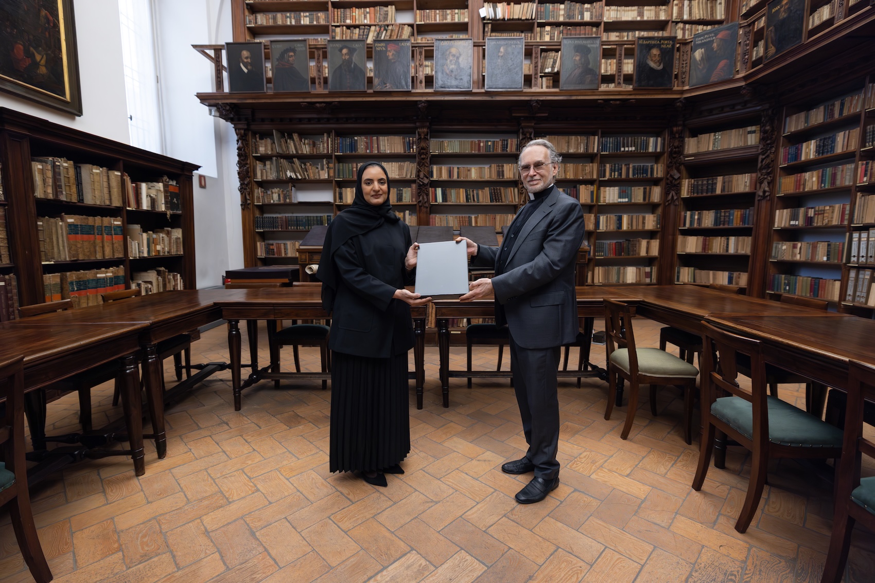 جاء ذلك خلال زيارة فريق من بيت الحكمة إلى المكتبة الإيطالية بمشاركة مروة عبيد العقروبي المديرة التنفيذية حيث التقى المونسنيور ألبرتو روكا مدير المكتبة واطلع الفريق خلال جولة تعريفية على أقسام المكتبة ومجموعاتها النفيسة بما في ذلك المخطوطات النادرة ومقتنيات الكتب التي تمثل إرثاً معرفياً يمتد عبر قرون وتضم آلاف الكتب والمخطوطات من بينها مجموعة متميزة من المخطوطات العربية والإسلامية إلى جانب أعمال ومقتنيات مرتبطة بأبرز الرموز الفكرية والفنية مثل ليوناردو دافنشي وجيوفاني باتيستا مونتيني.