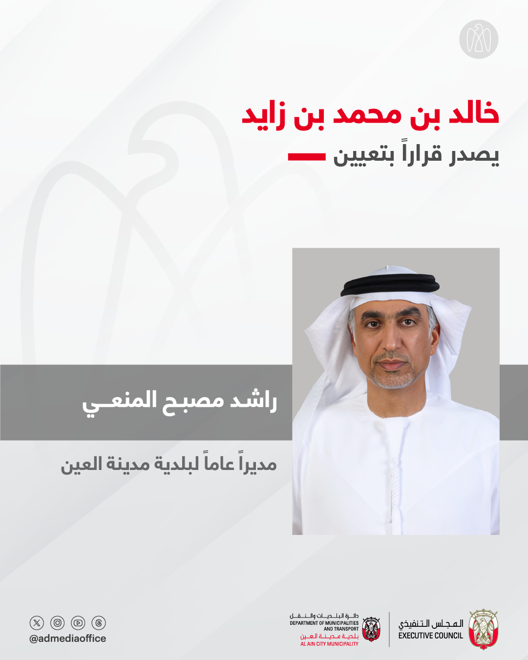 أبوظبي في 15 مايو /وام/ أصدر سموّ الشيخ خالد بن محمد بن زايد آل نهيان، ولي عهد أبوظبي رئيس المجلس التنفيذي لإمارة أبوظبي، قراراً بتعيين سعادة راشد مصبح المنعي، مديراً عاماً لبلدية مدينة العين.