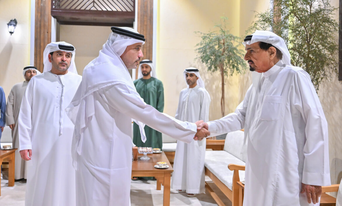 وتقبل صاحب السمو حاكم عجمان التهاني من سعادة المهندس عمر بن عمير المهيري مدير عام دائرة الأراضي والتنظيم العقاري، ووفد دائرة الشؤون القانونية، ووفد دائرة عجمان الرقمية، وجموع المهنئين بالشهر الفضيل.